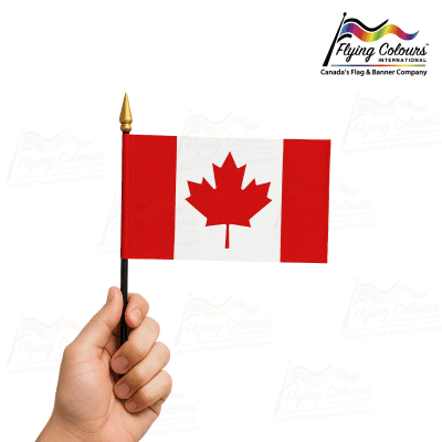These Canada flags are attached to sticks or poles for waving at parades, protests, or large gatherings. Available in various materials, from budget paper to durable polyester for reuse.